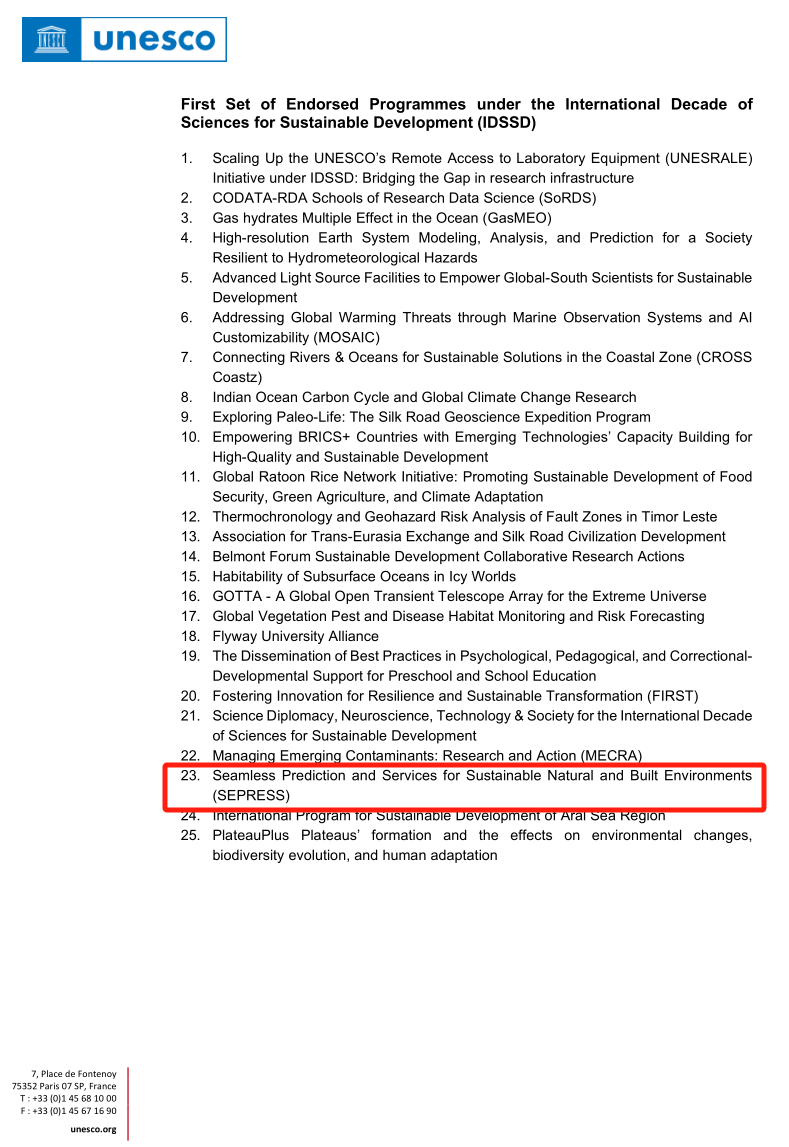 《2024—2033年科学促进可持续发展国际十年》决议于2023年8月通过,旨在通过科学促进全球合作,实现未来可持续发展。为落实“科学十年”(IDSSD)倡议,联合国大会指定联合国教科文组织(UNESCO)作为牵头机构统筹实施,并面向全球启动首批项目征集工作。经严格的专家评审和多轮筛选,最终全球 25 个兼具科学性与实践性的高质量计划入选首批认可清单。