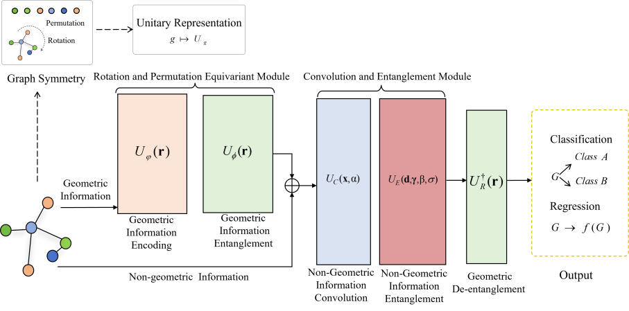 图2展示了 RP-EQGNN 模型的主要框架与工作流程。模型由三个核心模块组成:(1)旋转–置换等变模块:利用量子电路对节点坐标进行编码与纠缠,保证模型在旋转与置换下预测结果不变;(2)卷积与纠缠模块:在量子电路中引入基于距离与角度的边特征纠缠,充分捕捉非几何信息;(3)几何解纠缠模块:通过 Hermitian 共轭运算保持等变性,输出结果再经经典层完成分类或回归任务。