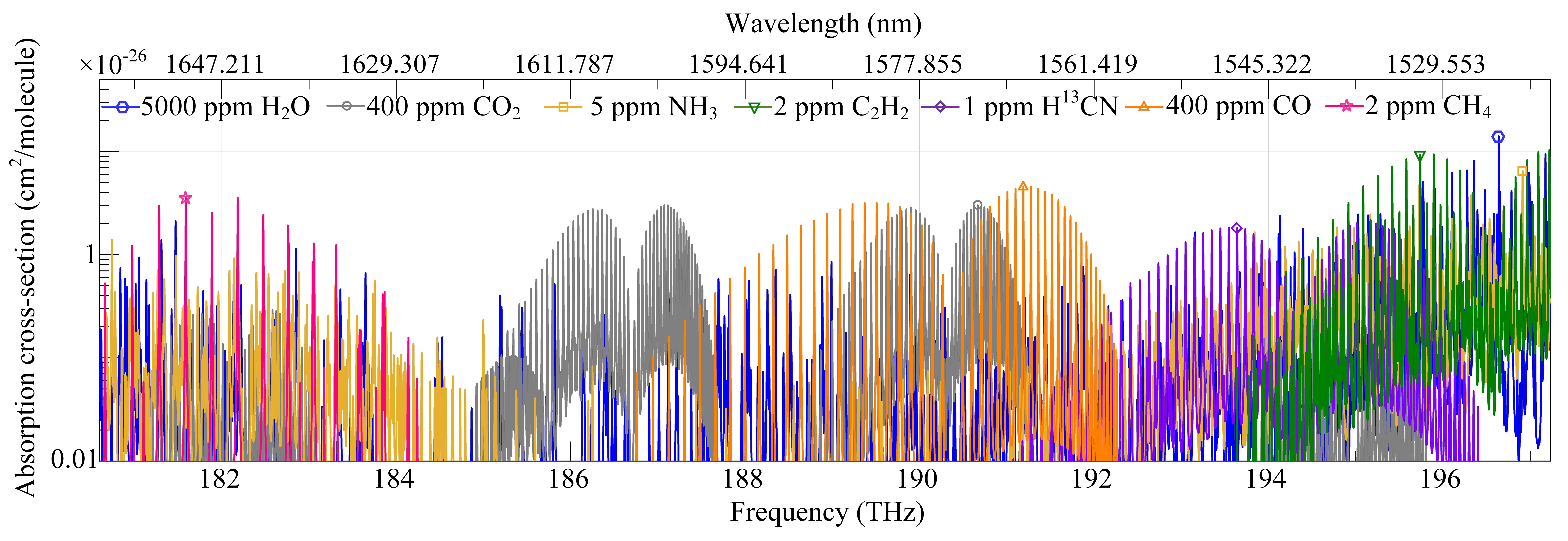 图3 实测CO、H13CN、C2H2、NH3(多峰结构)吸收光谱