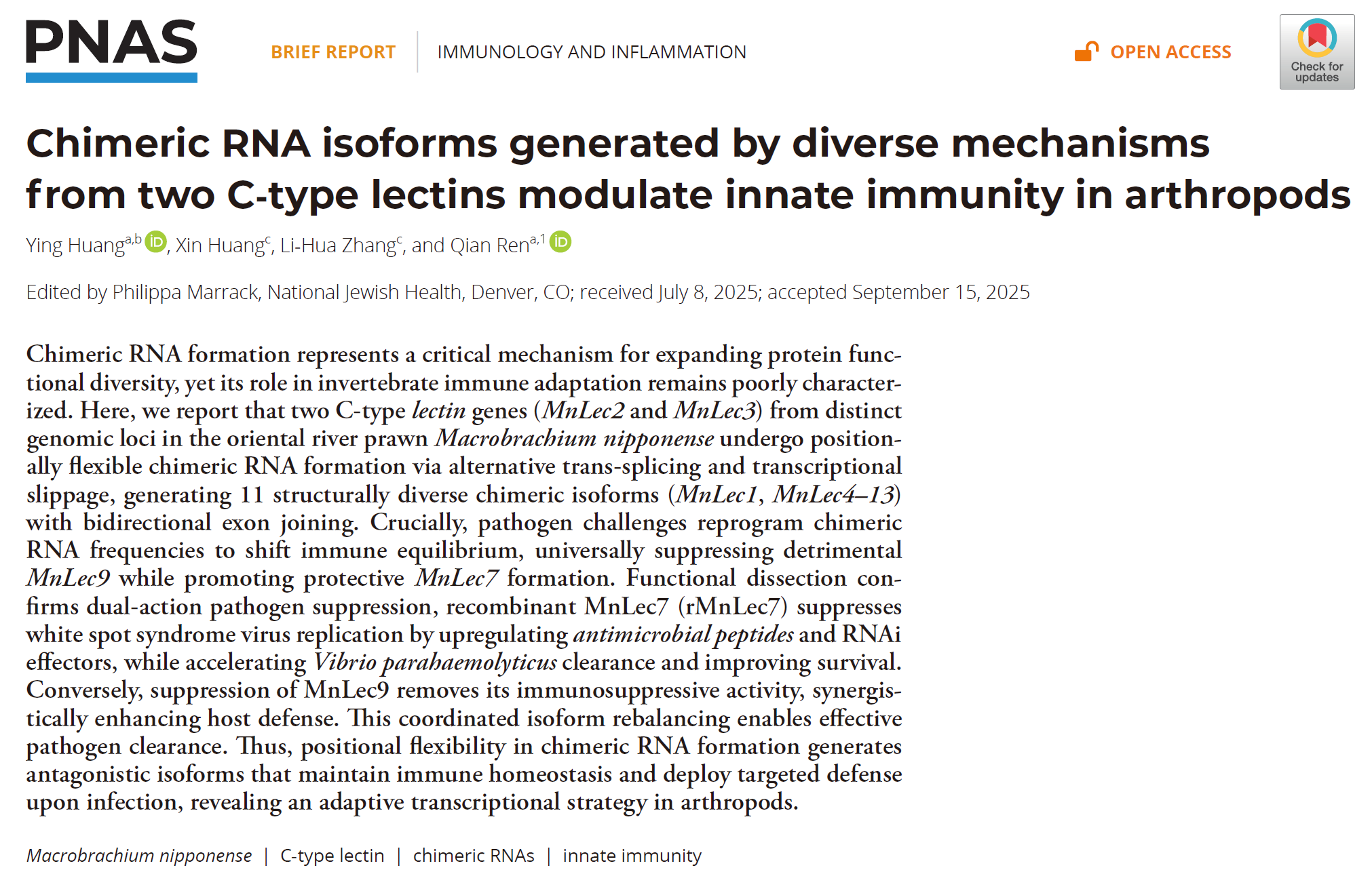 近日,beat365海洋科学学院海洋水产养殖团队在甲壳动物先天免疫调控机制研究方面取得重大突破,相关研究成果《Chimeric RNA isoforms generated by diverse mechanisms from two C-type lectins modulate innate immunity in arthropods》发表于国际顶级综合性期刊《Proceedings of the National Academy of Sciences of the United States of America》(PNAS)。beat365海洋学院任乾教授为唯一通讯作者,合作者包括河海大学黄颖副教授、南京师范大学黄欣副教授与研究生张利花。beat365气候系统预测与变化应对全国重点实验室为第一单位。