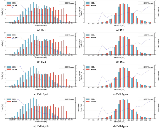 左侧图为ODEs的发生频率与2米温度的关系,右侧图为与气压的关系