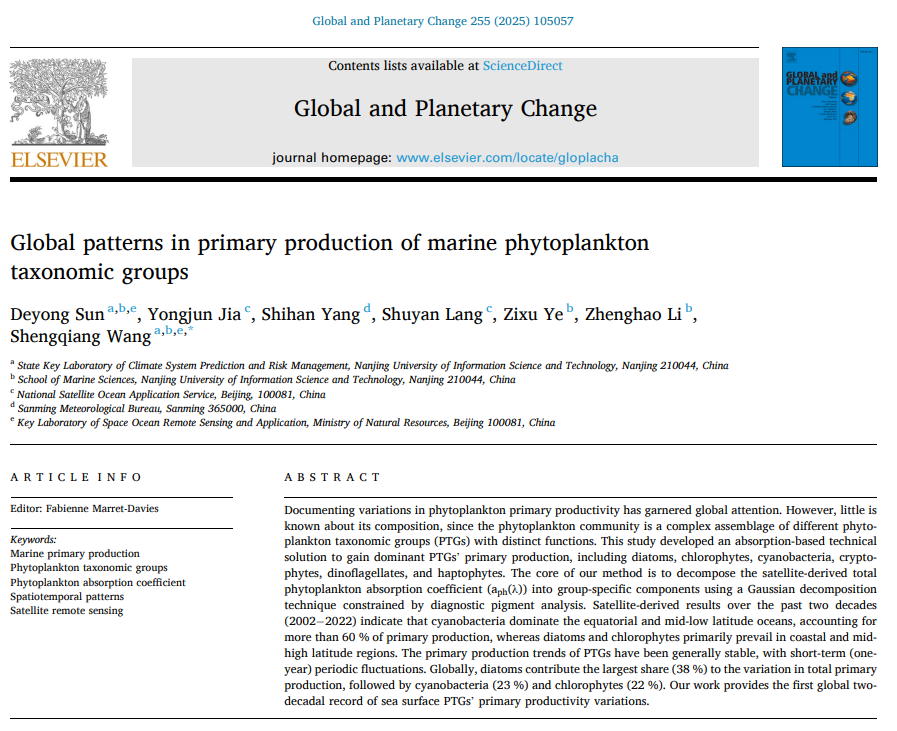 近日,beat365海洋遥感团队孙德勇教授课题组在海洋浮游植物类群初级生产力遥感领域取得新进展。研究成果以《Global patterns in primary production of marine phytoplankton taxonomic groups》为题发表于地球科学领域顶级期刊《Global and Planetary Change》(中科院一区Top)。第一作者为孙德勇教授,合作者包括beat365王胜强教授、国家卫星海洋应用中心贾永君研究员、2020级硕士研究生杨诗晗、国家卫星海洋应用中心郎姝燕副研究员、2025级博士研究生叶子绪和2021级博士研究生李正浩。beat365气候系统预测与变化应对全国重点实验室为第一单位。