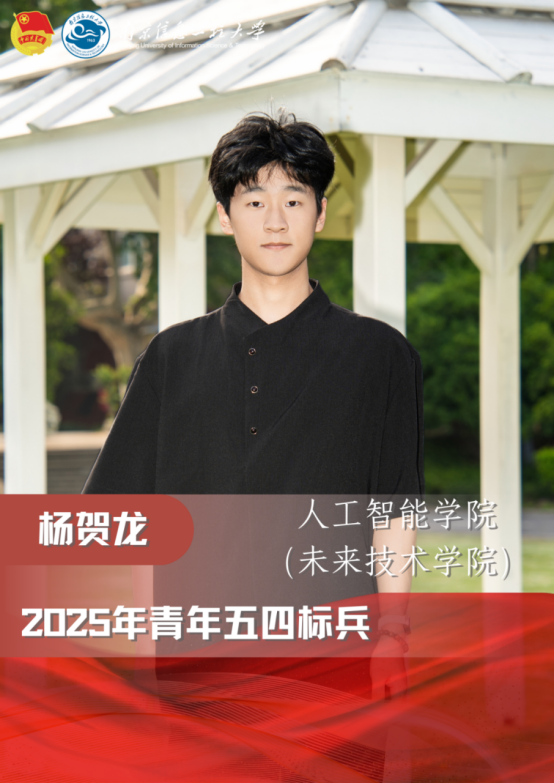 杨贺龙,中共预备党员,人工智能学院(未来技术学院)学生会执行主席、人工智能(产业拔尖班)班长、华为HERO联盟社长。他综合素质突出,上一学年综合测评成绩专业排名第一,多次获得三好学生、优秀学生干部等各类荣誉称号。在科创竞赛方面成绩优异,曾获中国机器人及人工智能大赛国家级一等奖、全国大学生信息安全与对抗技术竞赛国家级一等奖等十余项省级及以上奖项。他积极投身科研实践,现已投稿SCI一区论文一篇,发表SCI二区论文一篇,授权国家发明专利一项。在社会实践方面,他两次担任学院招生宣传学生代表,多次组织与参与优秀学子经验分享会,积极参与人工智能+气象招聘会等志愿者活动,用实际行动传播青春正能量。
