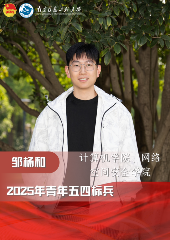 邹杨和,中共党员,2021级计算机科学与技术(腾讯实验班)班长。获江苏省“优秀学生干部”称号;成绩优异,连续两年专业排名第一,连续两年获国家奖学金,获校长奖学金、三好学生标兵等荣誉;积极参加学科竞赛,共获省级及以上奖项18项,其中包括获美国大学生数学建模特等奖提名奖、中国大学生计算机设计大赛全国二等奖等国家级及以上奖项8项;深耕科创,先后主持2项大学生创新项目,其中一项为国家级项目,以第一作者身份发表SCI(E)论文2篇,授权发明专利3项和软件著作权2项;积极参加志愿服务,多次参加课程宣讲活动,获“优秀帮扶导师”称号,现被聘为学校“青年讲师团”成员。目前已推免至东南大学攻读计算机科学与技术专业。